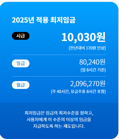 2025년 최저임금은 시간당 10,030원입니다. 주 40시간 근무 기준으로 월급은 2,096,270원이 됩니다. 여기에는 주휴수당이 포함되어 있습니다.